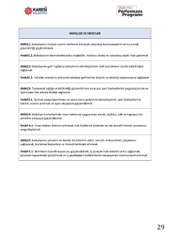 AMAÇLAR VE HEDEFLER AMAÇ1: Belediyenin hizmet sunum Hedef1.1: AMAÇ2: B Hedef2.1: AMAÇ3: sporcul Hedef3.1: AMAÇ4: Hedef 4.1: AMAÇ5: Belediyenin yönetim ve destek birimlerinin etkin, verimli ve koordine Hedef 5.1: 29